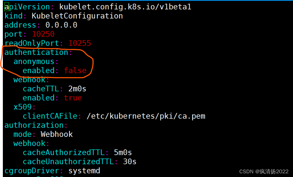 可以看到kubelet配置文件里匿名访问已经禁止。