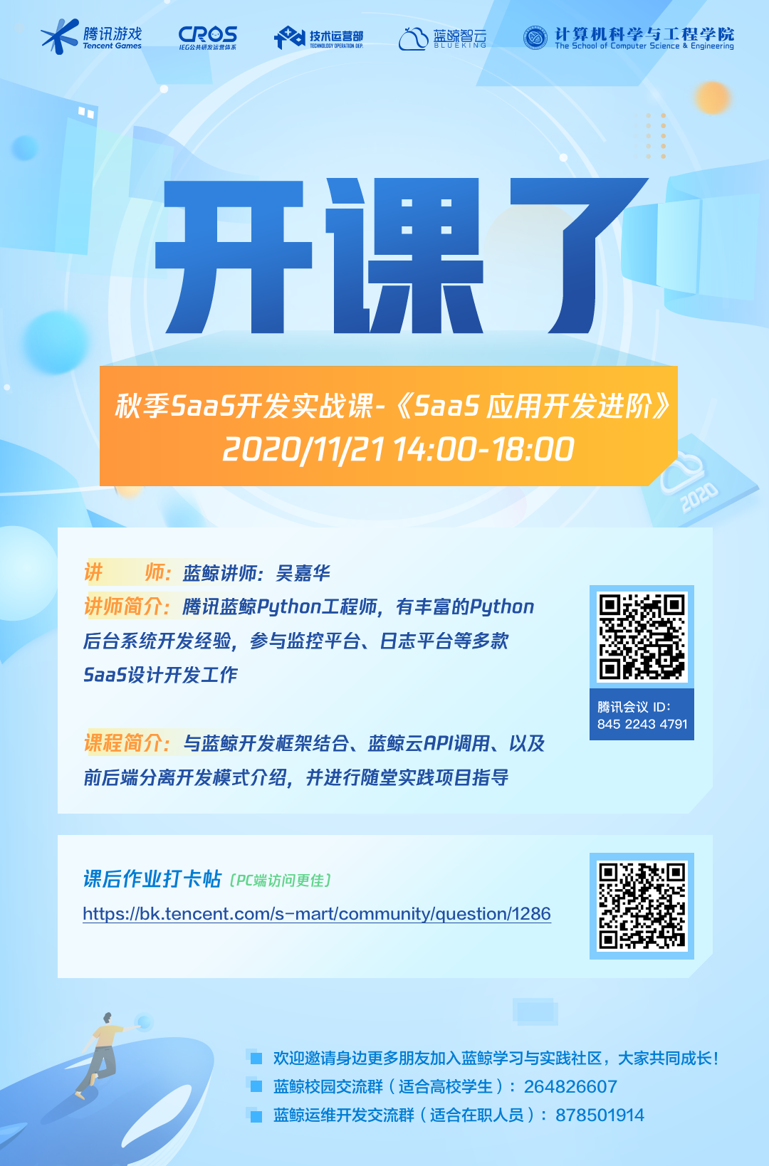 腾讯蓝鲸智云联合校园秋季开发SaaS实战课第七节《SaaS 应用开发进阶》将于11月21日线上开课,扫码立即预约直播学习。