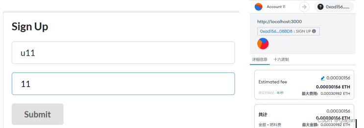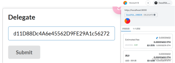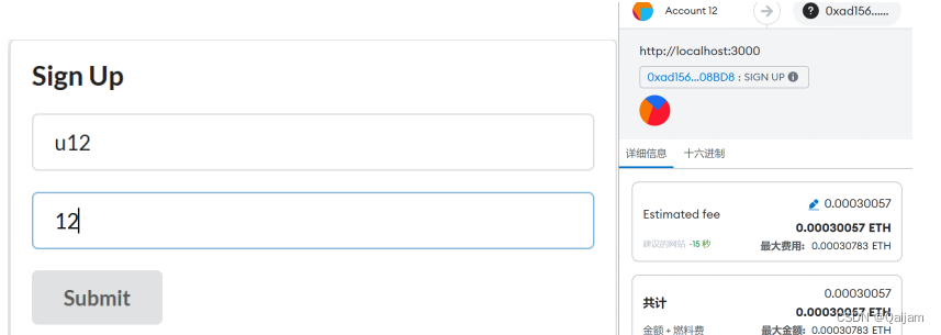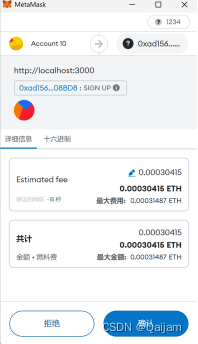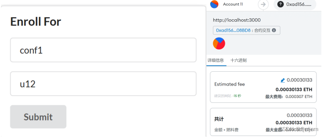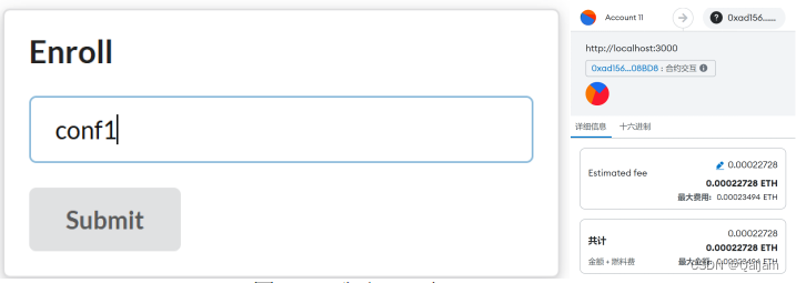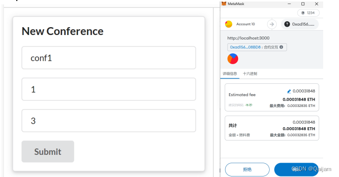在界面提交任意表单,执行相应合约方法时,如出现下图所示的窗口,则表明前端通Web3.js调用合约成功。该窗口表明,当前账户将执行合约交互操作,且该操作需要花费一定的Gas,需要手动确认支付。