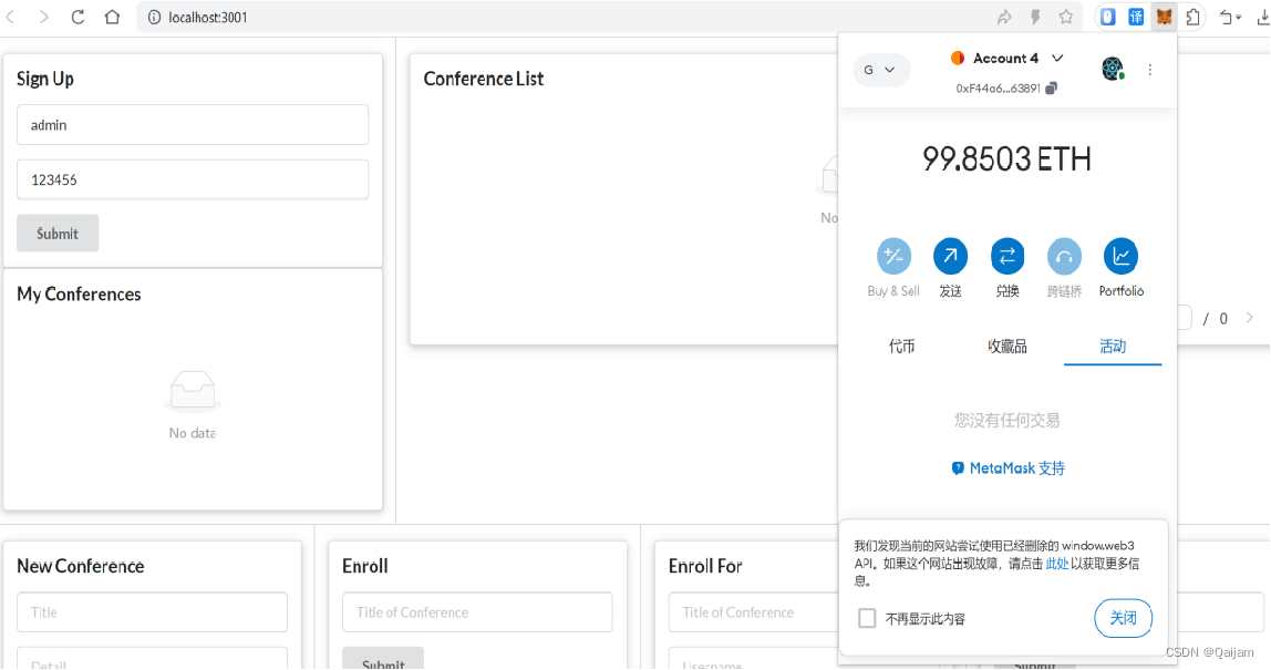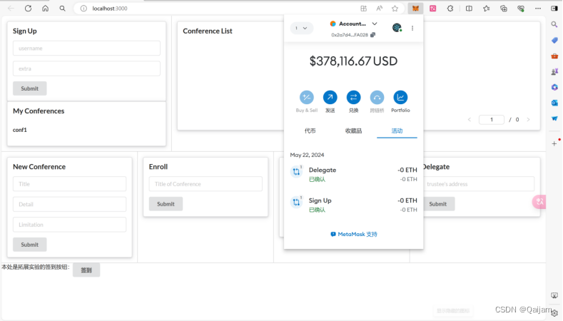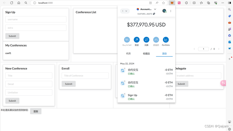 执行之后,成功打开部署的智能合约前端界面,并且能够成功打开MetaMask。