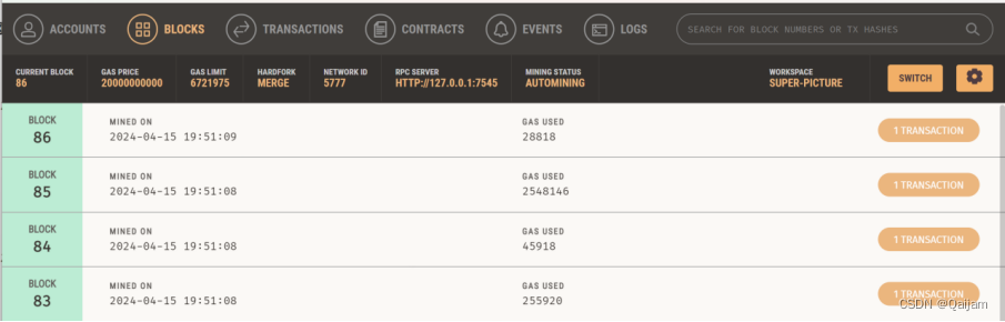 观察部署完成后 Ganache 的 Blocks、Transactions 以及 Logs 记录,记录如下: