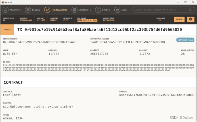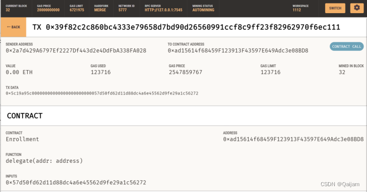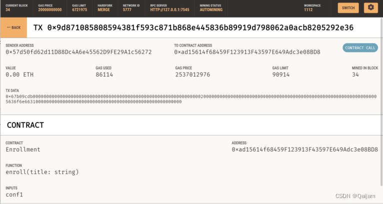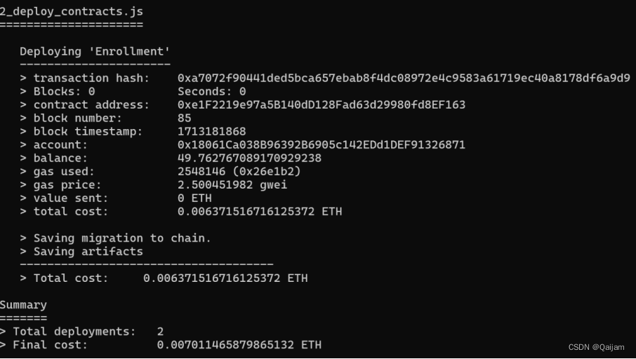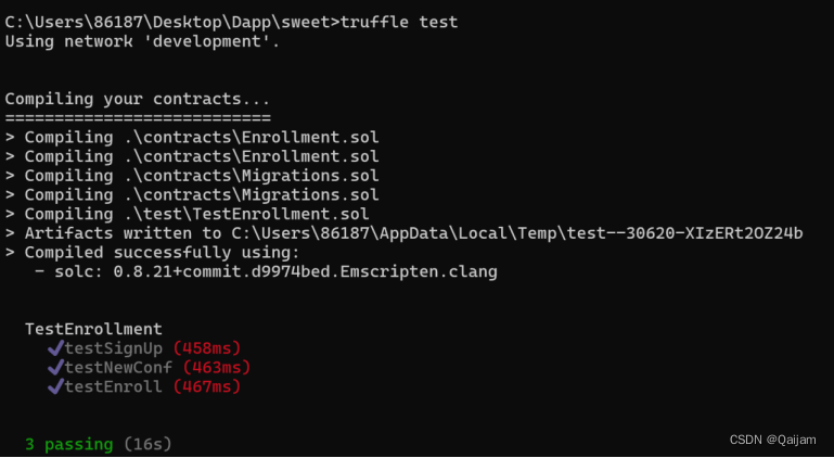 实施步骤:利用truffle初始化一个以太坊项目,将合约Enrollment.sol放入 contracts 文件夹,并编写部署名为 2_deploy_contracts.js 的脚本。然后为合约编写测试文件。利用 Ganache 搭建私链后,在终端进入 truffle 项目目录,输入 truffle test 进行测试。测试完成后在终端输入 truffle migrate 进行合约编译和部署。
