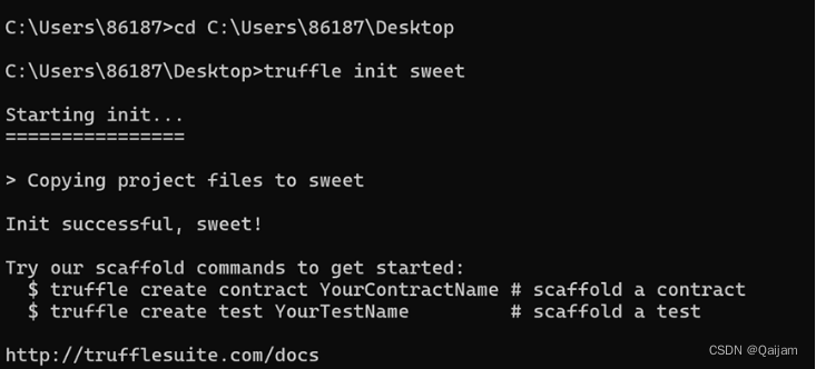 使用truffle新建项目,如图3-1,我们用truffle新建了一个名为sweet的项目: