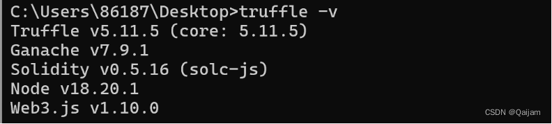 我们通过npm命令安装truffle,并在官网上下载了与truffle版本匹配的Ganache可视化客户端。图1-1、1-2是关于本次项目用到的所有环境的版本。
