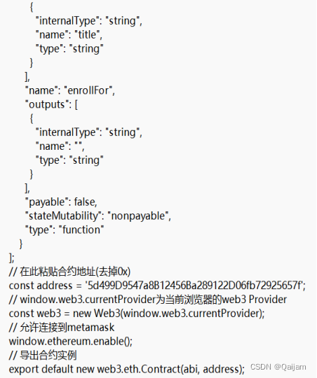将/build 文件夹下会生成的json文件中的ABI信息拷贝到contract.js文件中;在 Ganache 的 contracts 中找到部署的Enrollment合约,将合约地址复制到contract.js中。