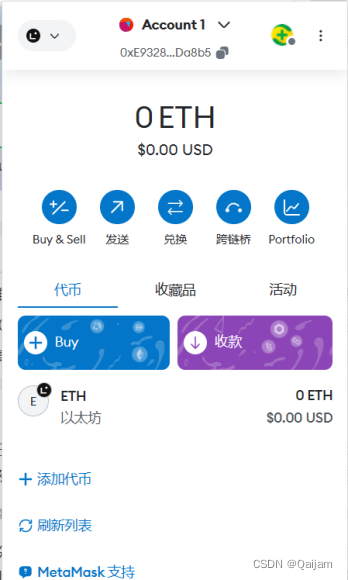 我们使用MetaMask(v11.13.3)来完成项目。如图1-4,这是启动MetaMask后的账户界面。