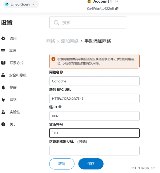 将以太坊网络从连接到以太坊主网改为自定义RPC接口。在自定义界面,将URL设为Ganache部署的地址和端口,单击“保存”按钮并切换至该网络,如下图4-3所示。