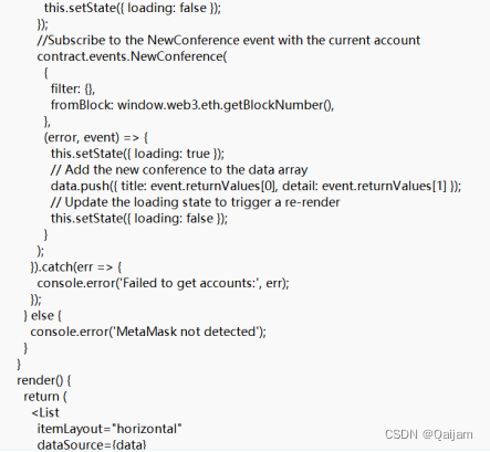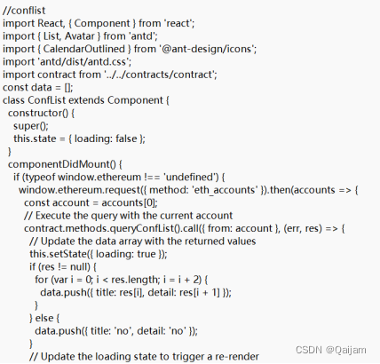 通过Web3.js实现智能合约和前端之间的调用和订阅:通过前端对以太坊节点进行 RPC 调用,执行合约中的函数,并将合约返回的数据,以及订阅的合约事件提醒及时展示在前端界面。按照实例更改相应组件下的js 文件以实现对组件的交互,将前端项目中的 src/contracts/contract.js 文件中的 ABI 位置代码更改为合约编译后自动生成的 ABI 信息。