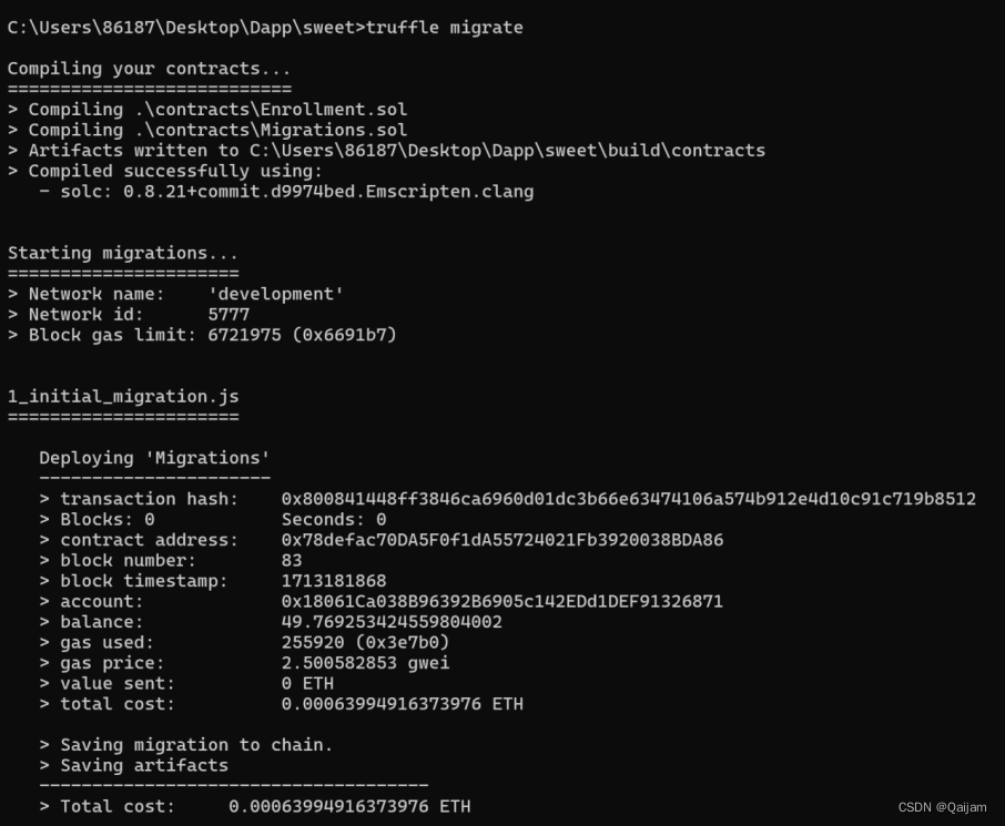 使用 Ganache重新搭建一条私链,然后在终端输入“truffle migrate”完成合约的编译和部署。控制台会输出各合约的部署情况以及总共的 gas 花费,Ganache 中的第一个账户即为该合约的部署者。