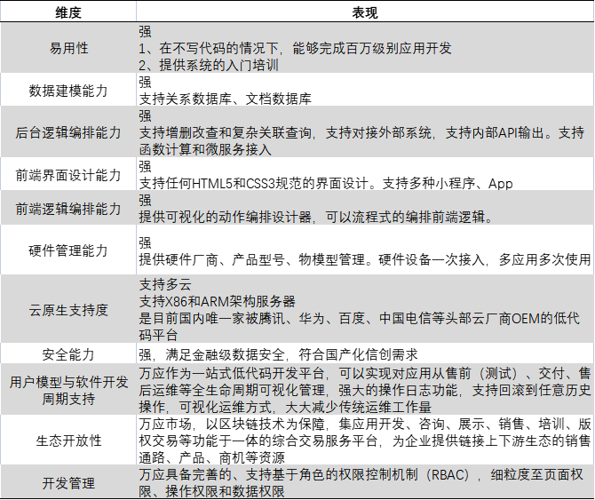 我们需要提供类似于狙击枪的参数,如射程、后坐力等。对于低代码平台而言,Gartner已给出低代码平台的关键能力维度,综合中国信通院提供的《低代码无代码开发平台通用能力》,万应低代码的回答如下: