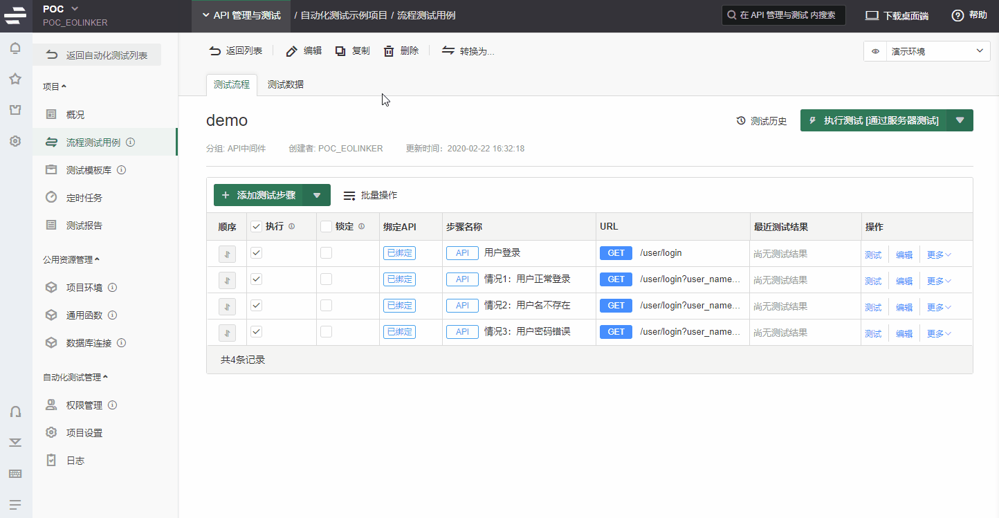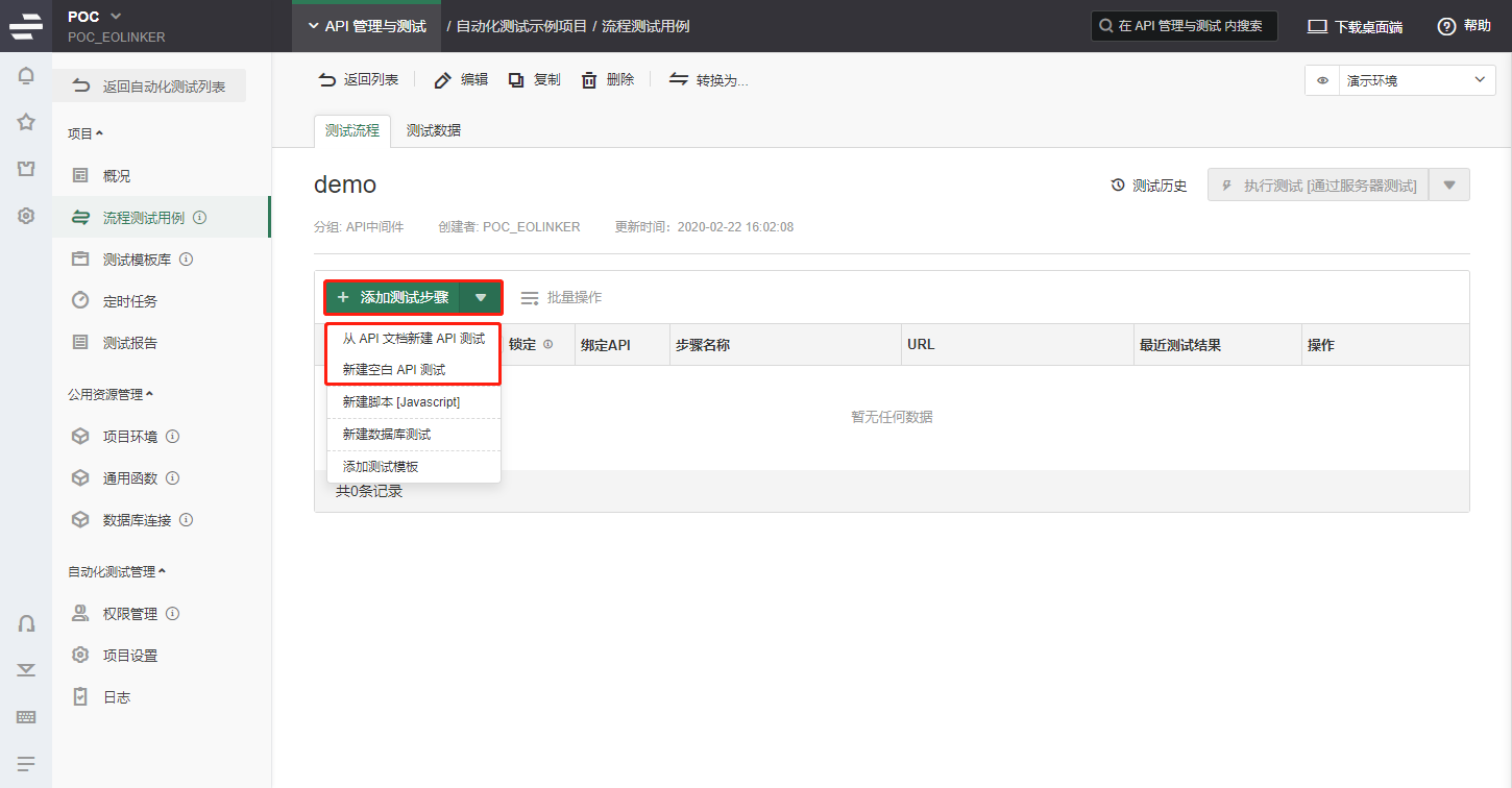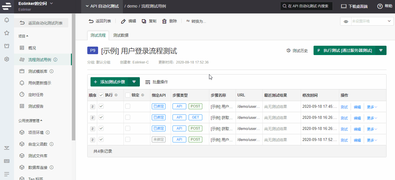 首先是登陆Eolinker,可以直接在线使用。 进入流程测试用例详情页,点击添加测试步骤,在下拉菜单中选择“从 API 文档新建API测试”,根据指引进行操作即可,这时会自动将测试步骤关联相应的API文档。