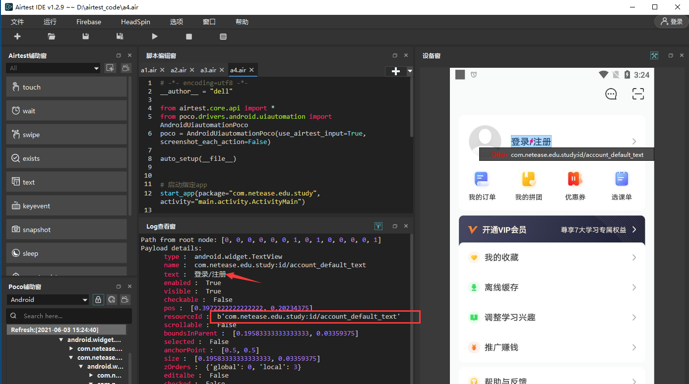 用Poco 辅助窗定位到元素,获取元素的resourceId : b’com.netease.edu.study:id/account_default_text’