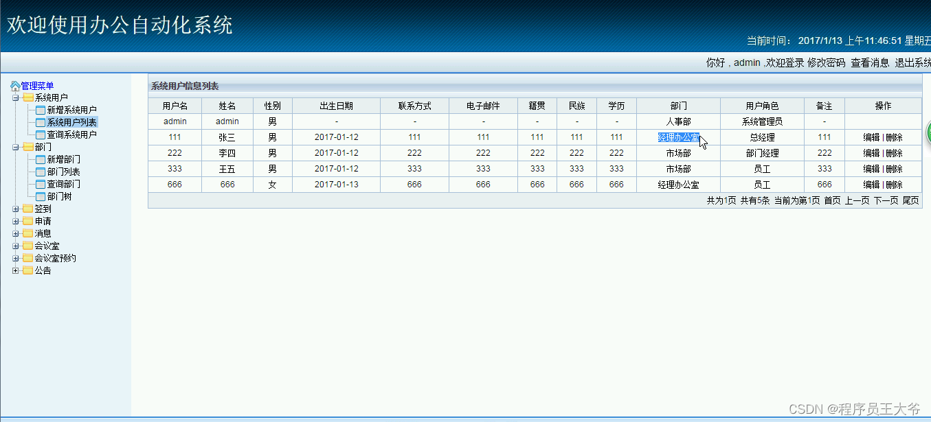 系统一共分为4个角色,分别是管理员、总经理、部门经理、员工。