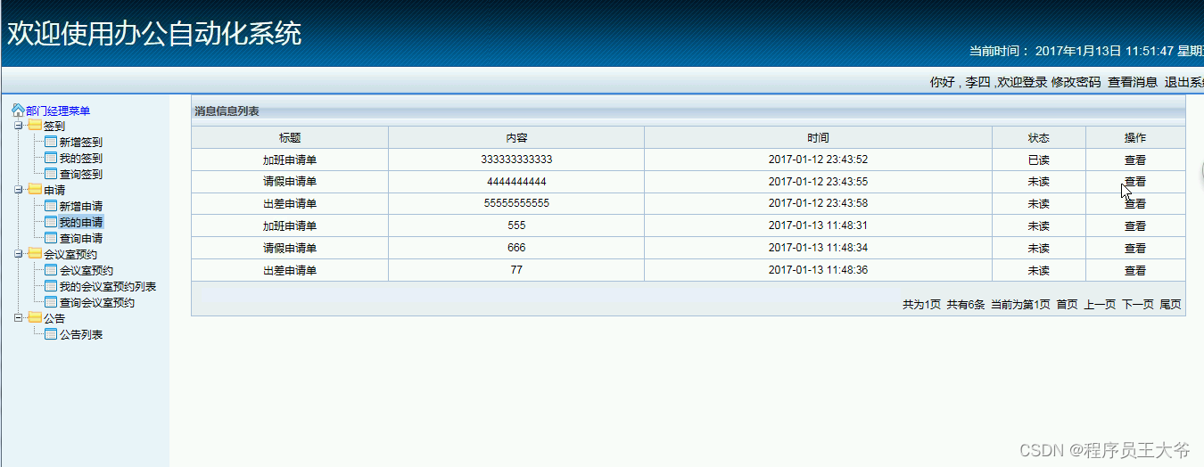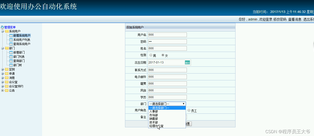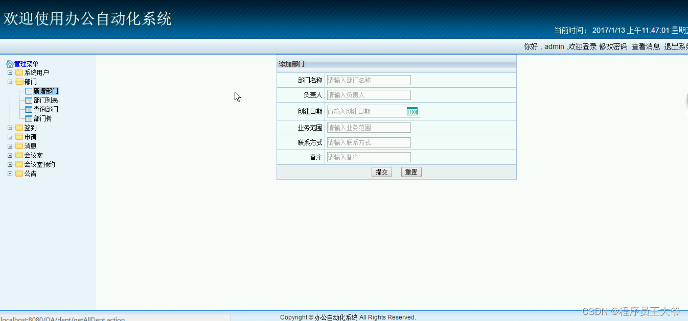 系统采用Java语言开发,数据库使用MySql,后端框架采用SSH系统一共分为4个角色,分别是管理员、总经理、部门经理、员工。管理员端功能:登录、系统用户管理、业务部门信息管理、签到信息管理,申请信息管理、会议室管理、会议室预约管理、公告信息管理。总经理端功能:登录、签到管理、会议室预约管理部门经理端功能:登录、签到信息管理、申请信息管理、会议室预约信息管理。员工端功能:登录、签到、申请、会议室预