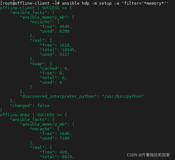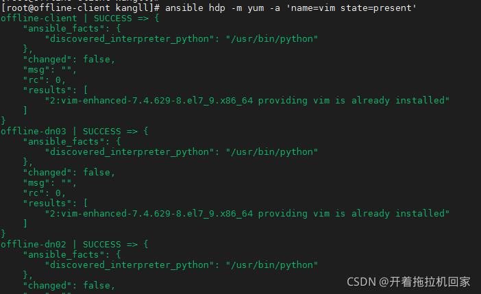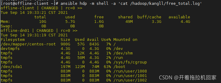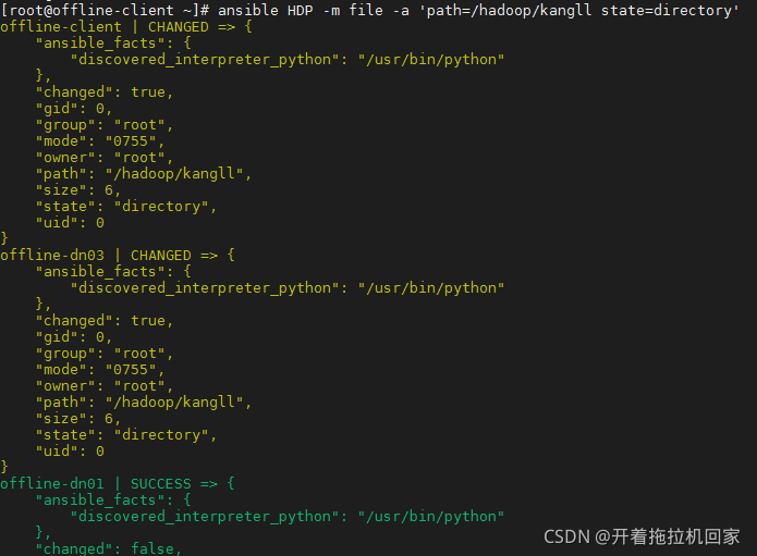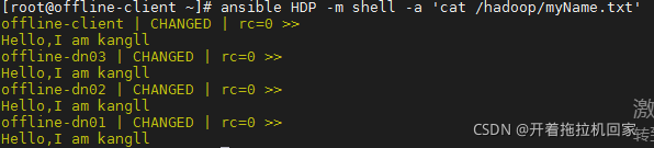 [root@offline-client ~]# ansible hdp -m shell -a 'cat /etc/passwd | grep kangll'