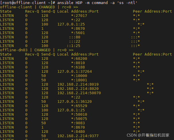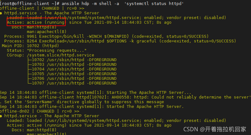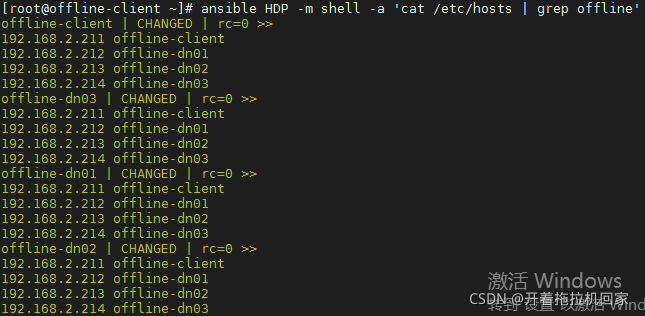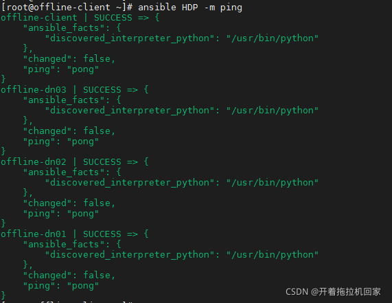 [root@offline-client ~]# ansible hdp -m service -a 'name=httpd state=restarted'