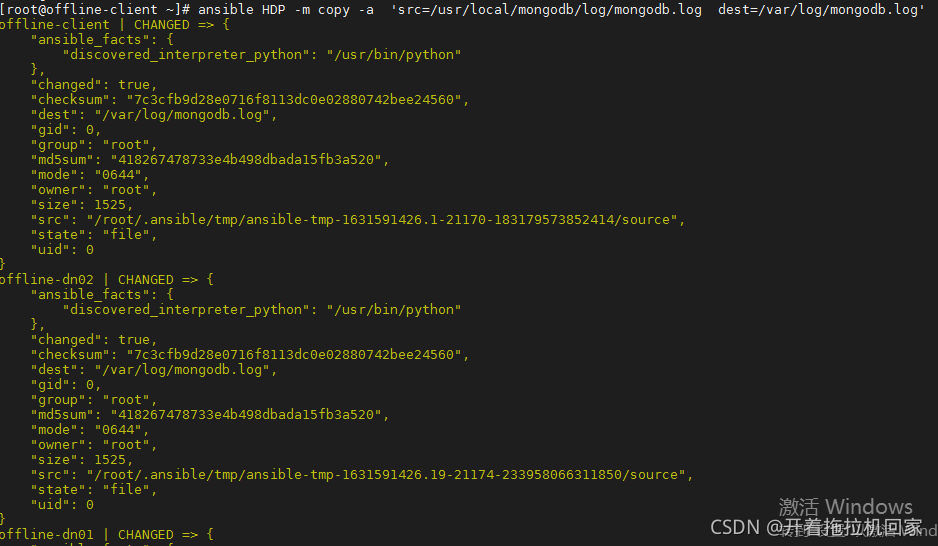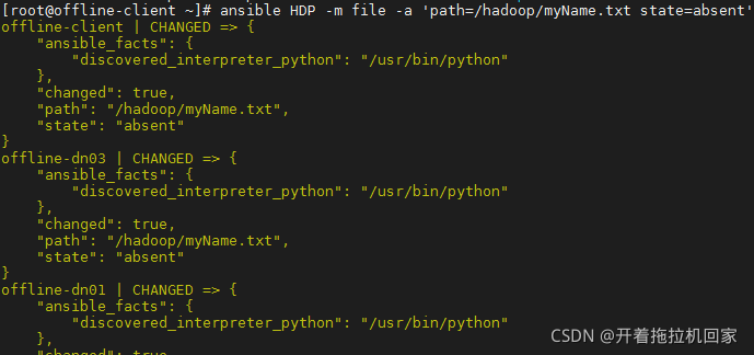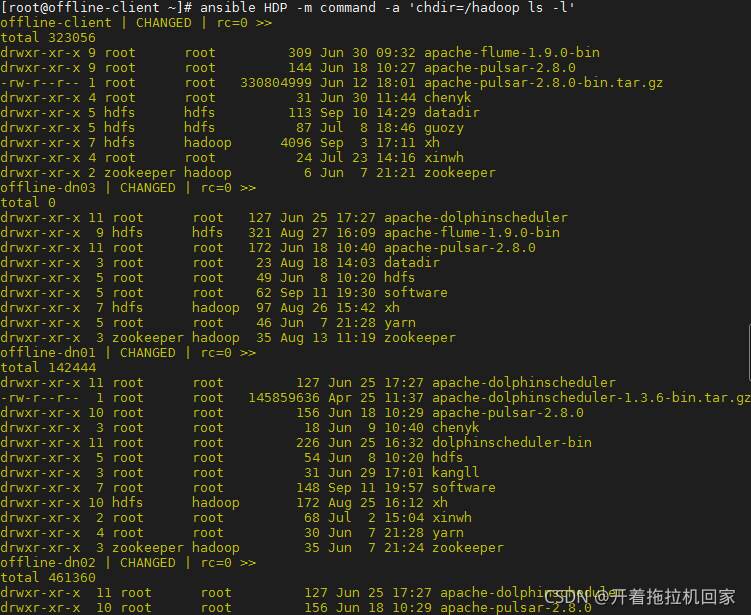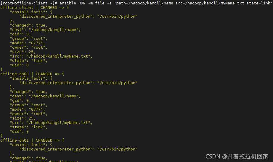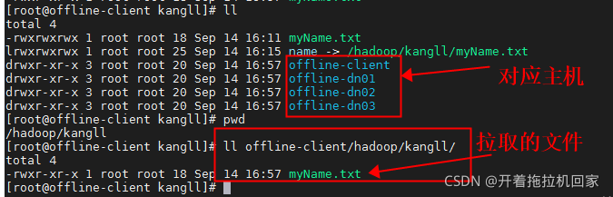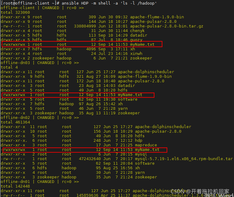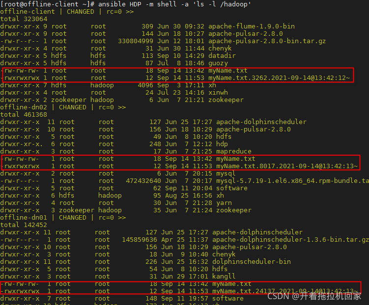 [root@offline-client kangll]# ansible HDP -m fetch -a 'src=/hadoop/kangll/myName.txt dest=/hadoop/kangll'