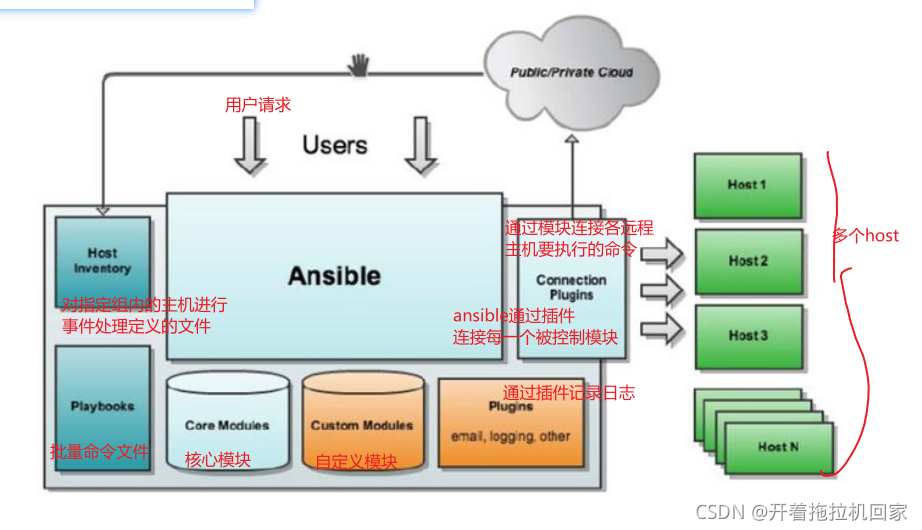 Ansible:Ansible核心程序。HostInventory:记录由Ansible管理的主机信息,包括端口、密码、ip等。Playbooks:“剧本”YAML格式文件,多个任务定义在一个文件中,定义主机需要调用哪些模块来完成的功能。CoreModules:核心模块,主要操作是通过调用核心模块来完成管理任务。CustomModules:自定义模块,完成核心模块无法完成的功能,支持多种语言。ConnectionPlugins:连接插件,Ansible和Host通信使用