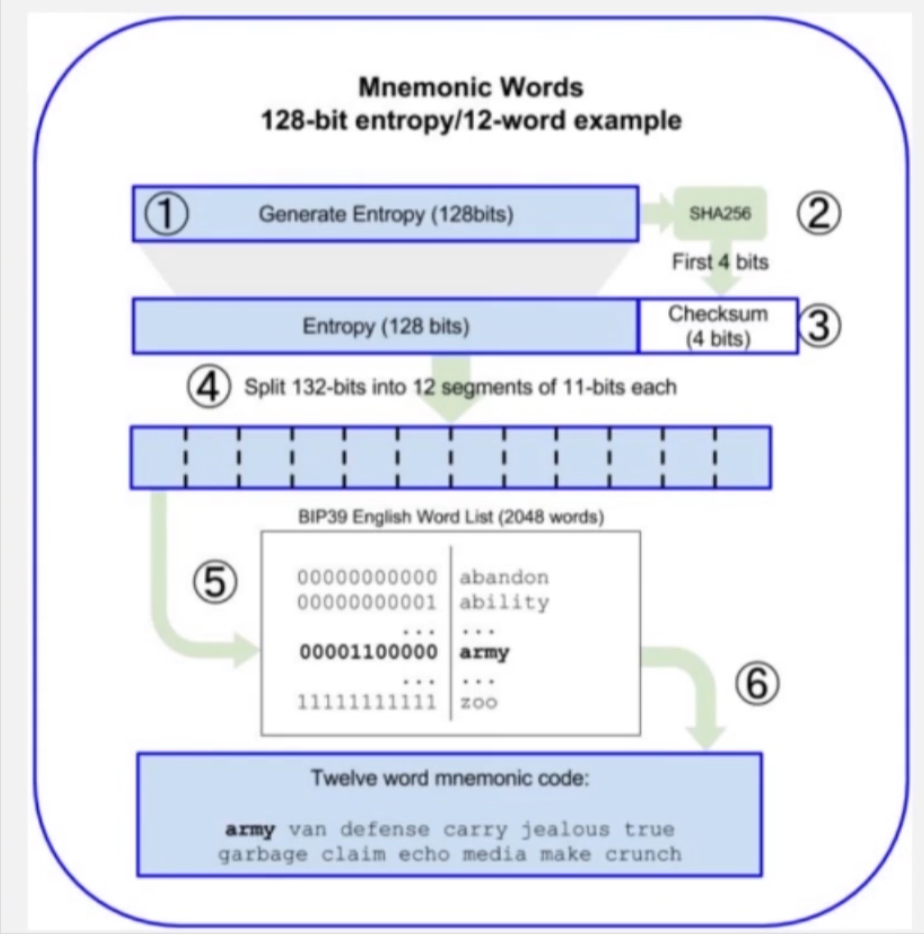 - 生成一个长度为 128~256 位 (bits) 的随机序列(熵)