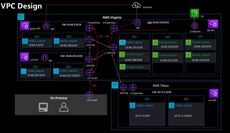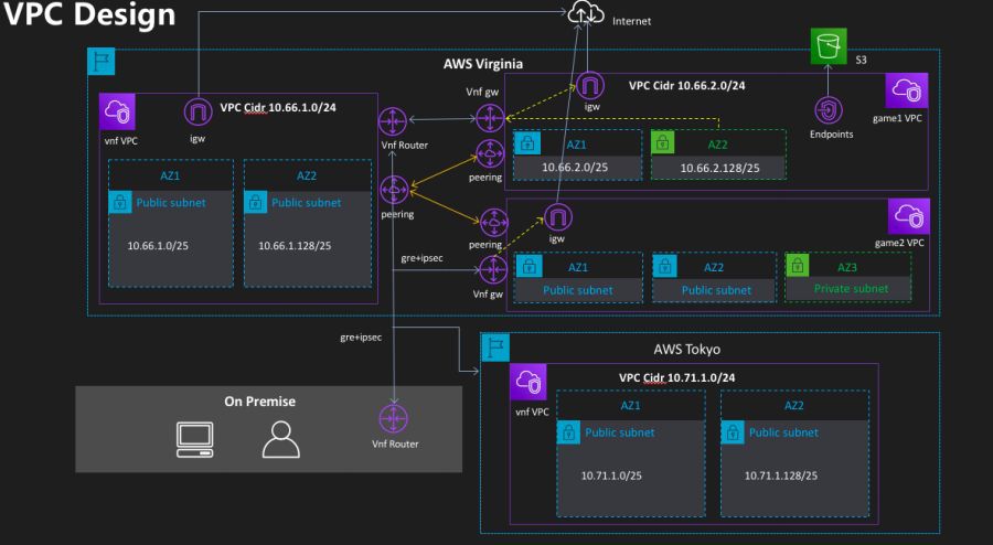 举个例子我需要在AWS Virginia的Region部署一个游戏服,通常来说我们会为一个游戏单独分配一个独立的VPC,这是为了做网络三层的隔离。