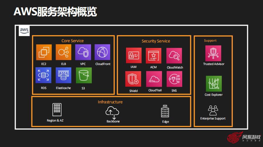 在AWS服务层面我们可能不会用到非常多或者复杂的服务,主要是依赖AWS比较底层的基础服务。比如说EC2,VPC,ELB,S3还有CloudFront,这些核心服务承载了主要业务,当然也会用到安全或者是监控方面的周边服务,以及贯穿始终的Support支持体系。