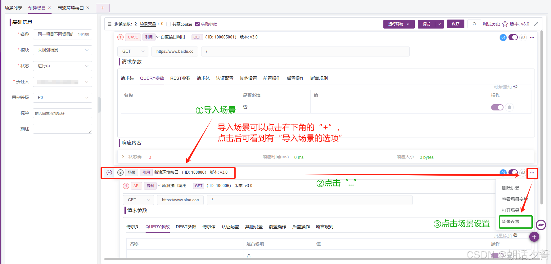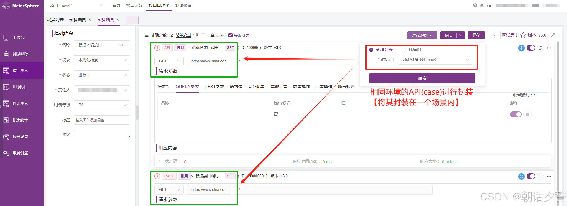 大家可以看到由于在接口自动化中选择对饮环境时只能选择一个环境所以这就导致我们复制过来的API(case)他的环境环境时错的,那这个时候我们可以选择场景进行封装并对其进行导入。
