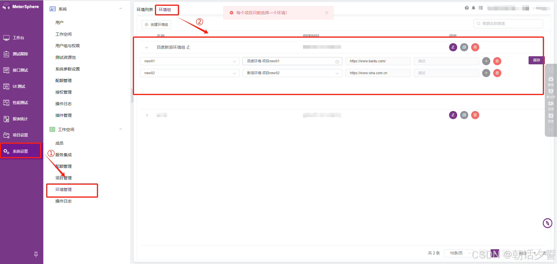 注意事项:1.环境组中添加环境时一个项目只能有一个环境。