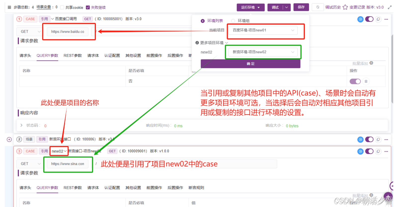 当引用或复制其他项目中的场景、API(case)时会自动出现更多项目环境的选择,当我们选择之后会自动设置其他项目复制或引用过来的接口的环境。