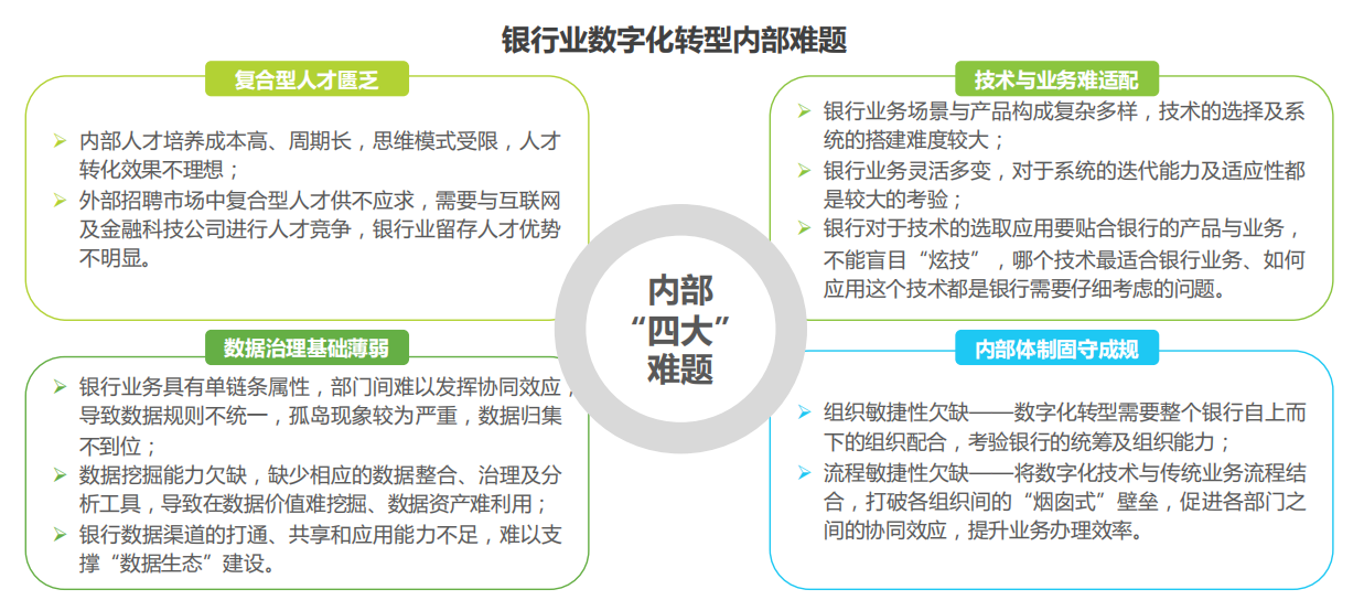 ①内部难点:主要卡在了复合型人才匮乏、技术与业务难匹配、数据治理基础薄弱、内部体制固守陈规这4个方面上;