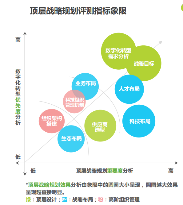 顶层战略规划:包含顶层设计、战略布局、高阶组织管理等。主要通过重要度、优先度与能力展现效果三重维度评测顶层战略规划。