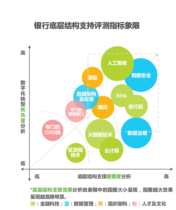 底层结构支持:通过优先度、重要度与支撑效果三重维度评测银行底层支撑,指标包括低代码、RPA、人工智能、数据安全、培训及激励。