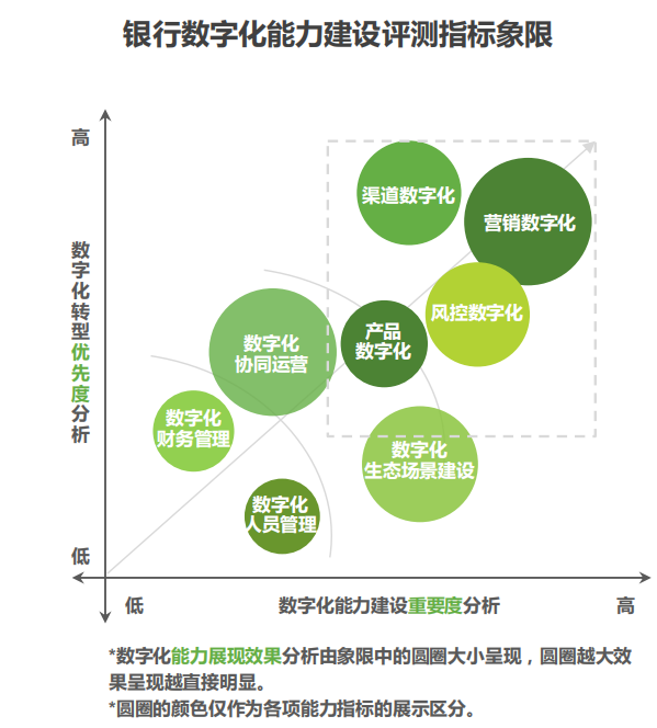 数字化能力建设:通过优先度、重要度、能力展现效果三重维度评测银行数字化能力转型水平,能力指标包括渠道数字化、营销数字化、产品数字化、风控数字化。