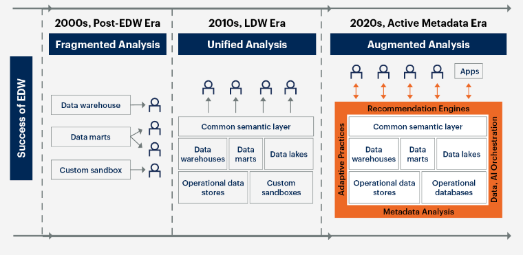 - 2000-2010—后EDW时代:这一时期的特点是碎片化的数据分析,数据集市依赖于数据仓库。根据你问的是谁,你得到的事实版本不同,因为每次数据集市整合都会导致另一个数据孤岛,从而导致分析碎片化和不一致。