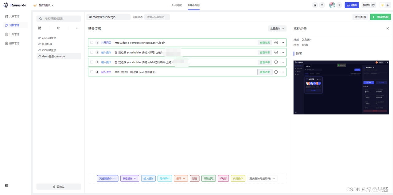 继 V3.0.0版本上线UI自动化功能后,RunnerGo团队还设计了插件UI-IDE,为测试人员更高效的使用UI自动化布置场景提供方便,我们可以对UI操作流程进行录制,然后直接导入到场景中。