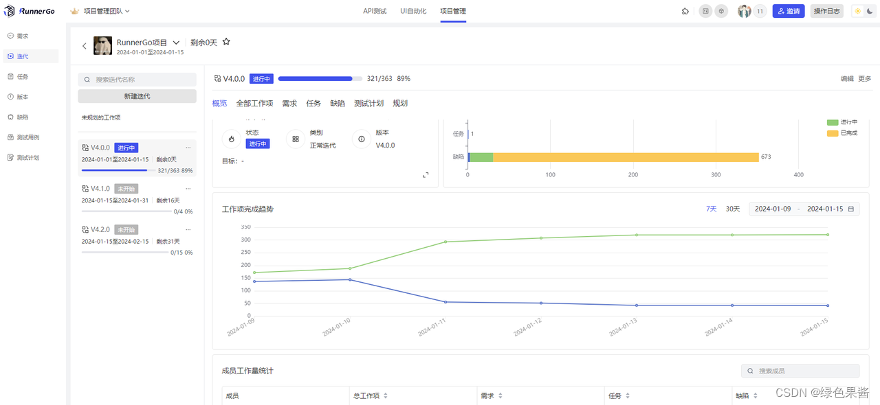 在迭代模块中,加入了“概览”,可以对当前迭代数据进行展示,用图表形式更方便用户对当前概况进度进行整体查看。