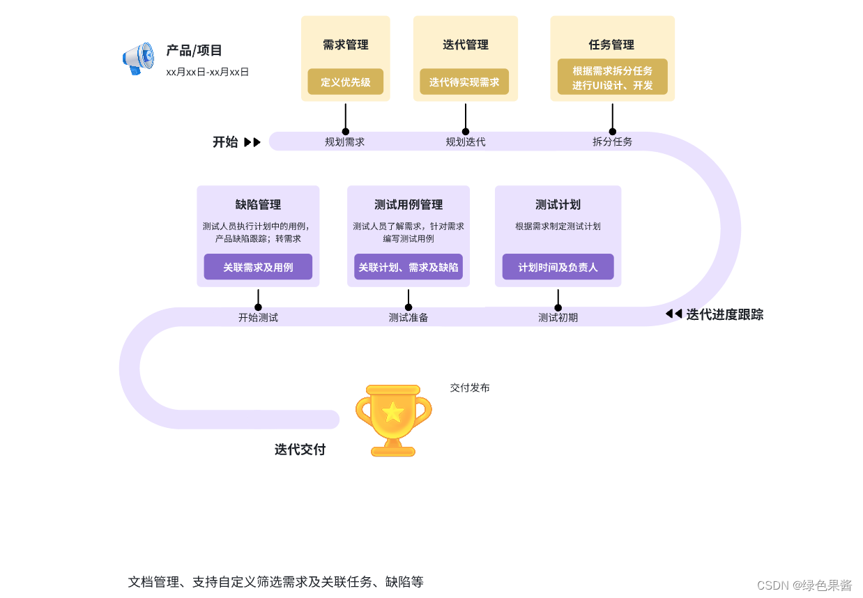 “项目管理”包含需求、迭代、任务、版本、缺陷、测试用例、测试计划七大模块。