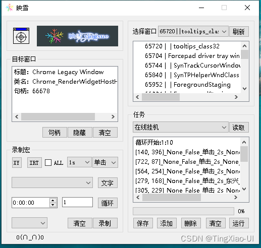 连点工具是一款可以模拟键鼠后台操作的连点器工具。支持鼠标连点、键鼠脚本录制,支持辅助您实现办公自动化以及辅助游戏操作。功能简洁易用,非常方便操作。连点工具让您在在玩游戏、网购抢购的时候全自动点击鼠标!主要功能有: 1. 支持快速鼠标点击, 一秒可高达几百次次点击。 2. 鼠标连点器可录制鼠标和键盘的操作,可以循环以及定时回放脚本。 3. 可播放脚本代替你进行各种操作,一键升级、自动挂机、游戏刷分。