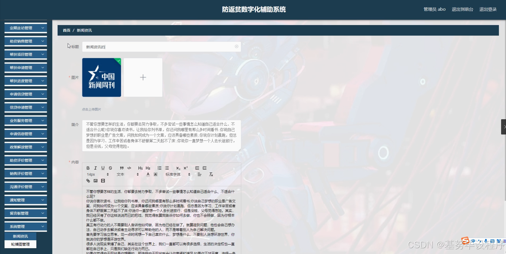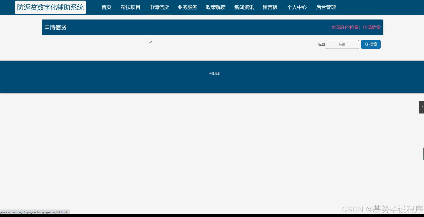 - 经济支持功能:涉及申请信贷、信贷申请审核等功能。银行可以通过系统对脱贫户或帮扶企业的信贷申请进行评估和审核,提高信贷业务的办理效率。脱贫户也能够及时了解信贷政策和申请流程,获取必要的经济支持。