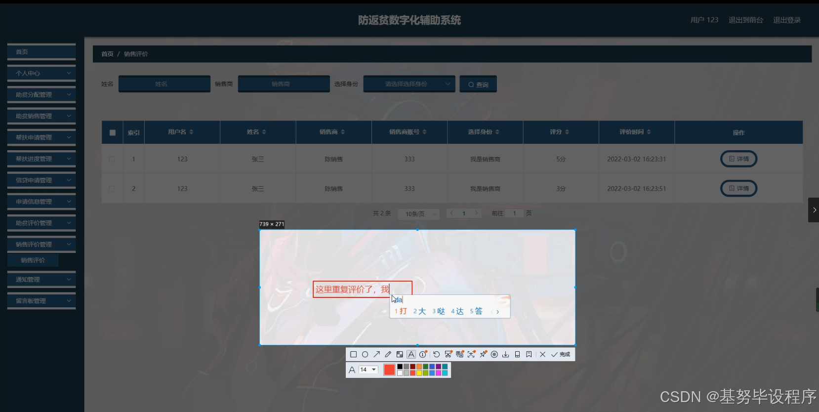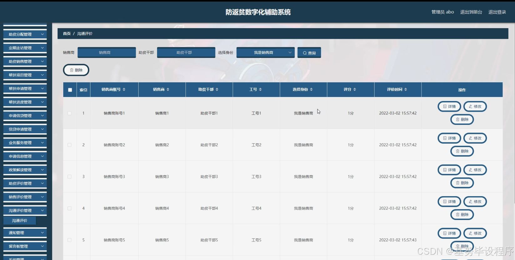 - 业务服务与评价:包括业务服务(如销售商为脱贫户提供的销售渠道服务)、助贫评价、帮扶评价、沟通评价等功能。通过这些功能,各主体之间可以进行有效的互动和反馈,促进帮扶工作的质量提升。例如,脱贫户可以对助贫干部的工作进行评价,帮扶企业可以对帮扶项目的效果进行评估。