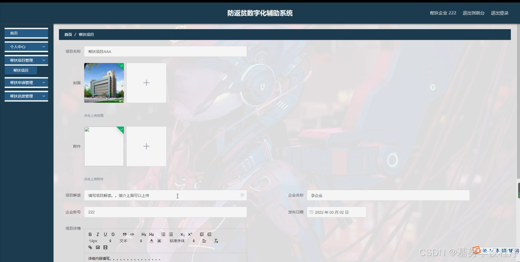 - 帮扶资源调配:包括助贫分配、帮扶项目管理、帮扶申请与进度跟踪等功能。系统根据地区分类等因素,合理分配帮扶资源,确保资源能够精准到达有需求的脱贫户。同时,帮扶企业和助贫干部可以通过系统实时跟踪帮扶项目的进展情况,及时调整帮扶策略。