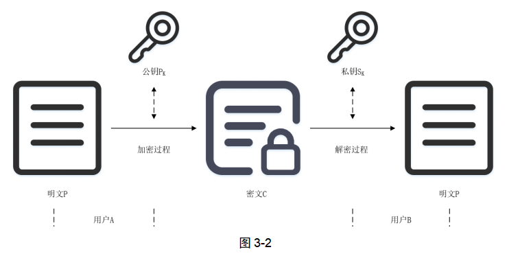 非对称密码体制的密钥成对出现,分为公钥和私钥两个部分,公钥PK用于加密或验证签名,私钥SK用于解密或签名,只有解密者知道。两个密钥之间不能从公钥推算出私钥,用公钥加密的数据只能使用对应的私钥解密,用私钥签名的数据只能使用对应的公钥验证。非对称加密的原理如图3-2所示。用户A使用用户B的公钥PK对明文P进行加密得到密文C,用户B用自己的私钥SK对密文C解密得到明文P。非对称密码系统与对称密码系统相比,不仅具有保密功能,同时也能实现密钥分发和身份认证。基于数字签名的身份认证是非对称密码系统的典型应用。在这个过程中,用户A先用自己的私钥SK对消息M进行签名得到S,随后用户B使用用户A的公钥PK对M、S进行验证,来判断S是否为用户A对M的签名。在一个典型的通信系统中,消息M是用户B发给用户A的一个随机数,如果用户A能够用M和自己的私钥SK计算出正确的签名S,并通过用户B的验证,则用户B可以确认用户A的身份,否则用户B将拒绝与用户A进行后续的通信。