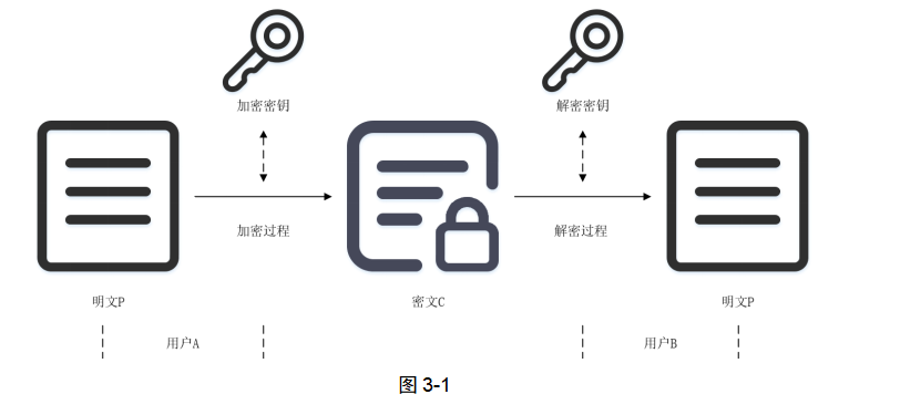 一个密码系统由密码算法和密钥两个基本组件构成。密钥是隐私数据,由用户自行保管,而算法是公开的,任何人都使用同一种算法。对称加密的原理如图3-1所示。对称加密是一种变换,用户A向用户B发送一份经过加密的消息,传输给用户B,用户B收到消息并逆向解密出原始的信息。