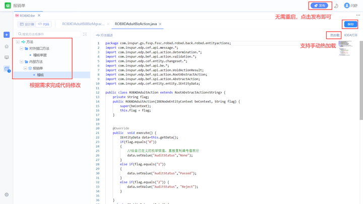 构件热加载指的是:构件代码修改后,无需重启应用,通过WebIDE的部署或发布工程后,即可正常调用。