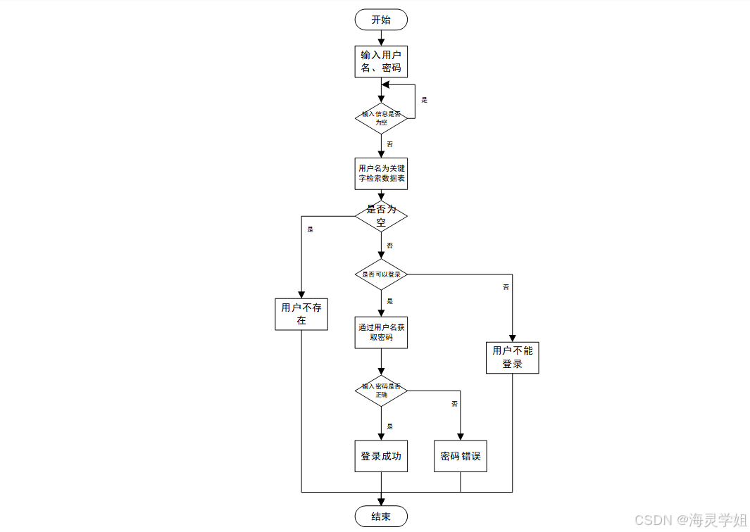 在登录流程中,用户首先在Vue前端界面输入用户名和密码。这些信息通过HTTP请求发送到Java后端。后端接收请求,通过与MySQL数据库交互验证用户凭证。如果认证成功,后端会返回给前端,允许用户访问系统。这个过程涵盖了从用户输入到系统验证和响应的全过程。如图5-1所示: