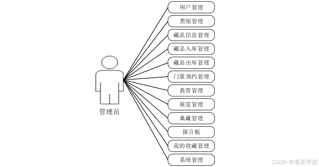 (1)、管理员关键功能包含用户管理,类别管理,藏品信息管理,藏品入库管理,藏品出库管理,门票预约管理,教育管理,展览管理,典藏管理,留言板,我的收藏管理,系统管理等进行管理。管理员用例如下: