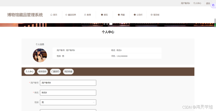 管理员进入主页面,主要功能包括对系统首页,个人中心,用户管理,类别管理,藏品信息管理,藏品入库管理,藏品出库管理,门票预约管理,教育管理,展览管理,典藏管理,留言板,我的收藏管理,系统管理等进行操作。管理员主页面如图5-6示: