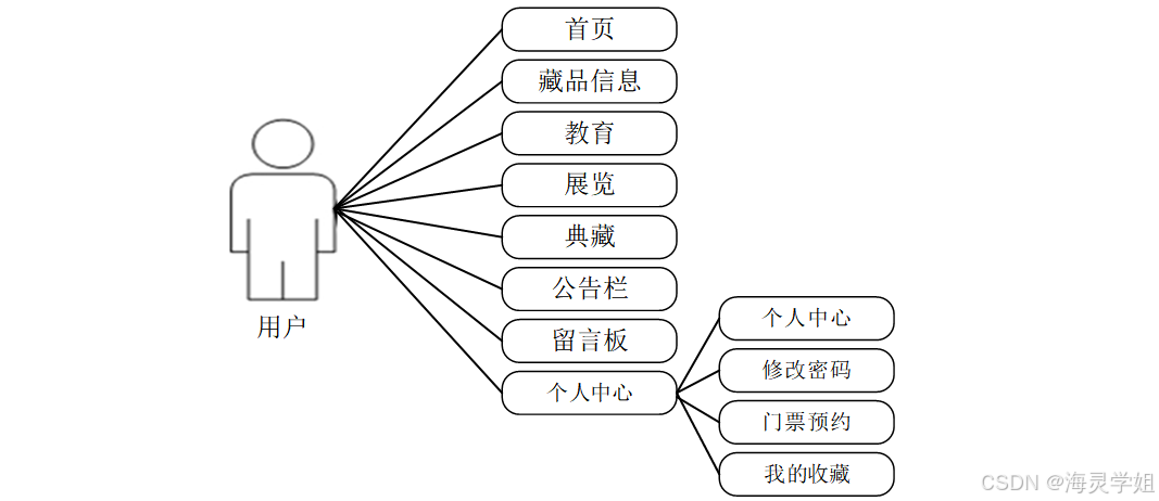 (2)、用户关键功能包含首页,藏品信息,教育,展览,典藏,公告栏,留言板等进行管理。用户用例如下:
