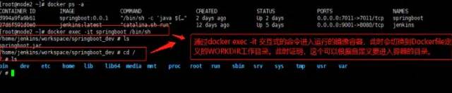 WORKDIR 工作目录说明进入容器此时会有一个.jar是在Dockerfile的ADD添加进去