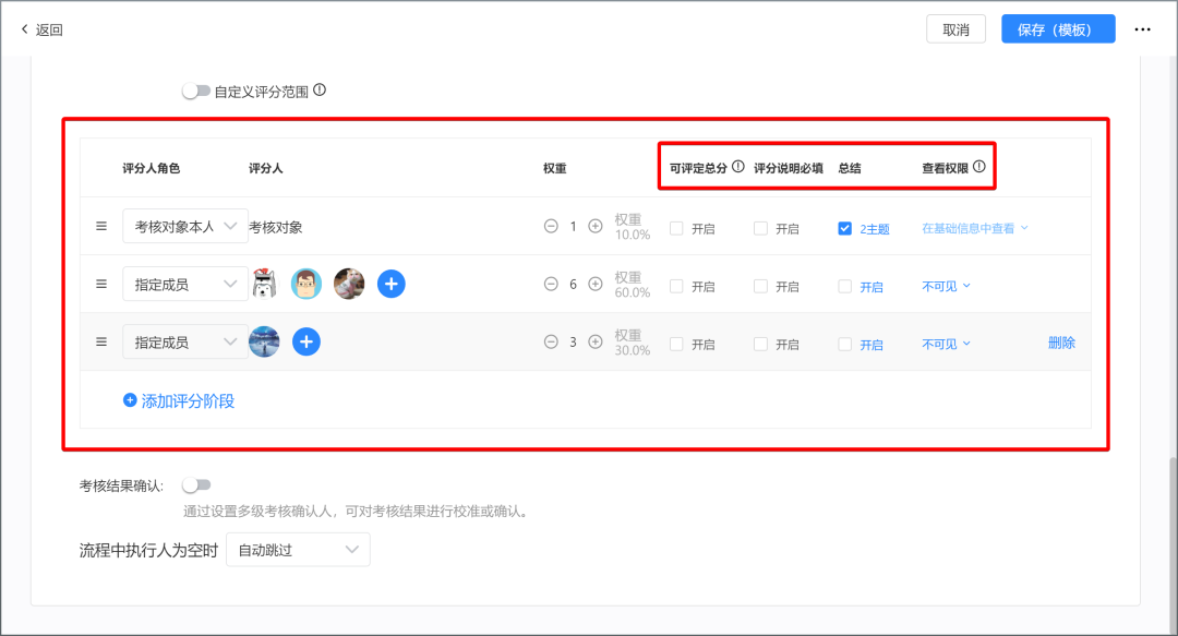 在绩效考核模板的评分人配置环节你可针对每一位评分人进行单独配置评分权限和可见性。