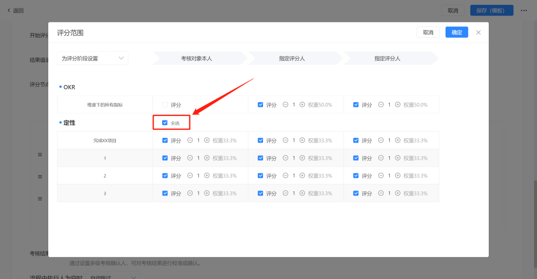 而且,你还可以为每个考评指标自定义设置权重,通过权重设置,可以对员工的态度、能力、素质得分更科学的评估。